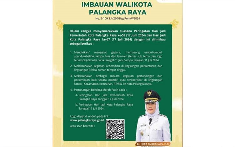 Hal ini tertuang dalam Imbauan Pj Wali Kota Palangka Raya, Hera Nugrahayu No 8.100.3.4/260/Bag.Pem/V/2024. Dia mengajak seluruh lapisan masyarakat untuk berpartisipasi dalam menyemarakkan perayaan tersebut.