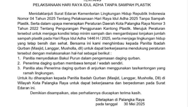 PALANGKA RAYA, INFOBORNEO.COM – Dalam rangka menyambut Hari Raya Idul Adha 1446 Hijriah, Pemerintah Kota Palangka Raya menerbitkan Surat Edaran Wali Kota tentang pelaksanaan Idul Adha tanpa sampah plastik. Langkah ini merupakan bagian dari upaya pemerintah untuk menekan penggunaan kantong plastik sekali pakai.