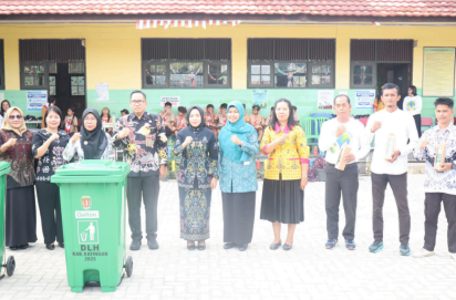 KASONGAN, INFOBORNEO.COM – Ketua TP-PKK Kabupaten Katingan, Ny. Sumiati Saiful, bersama Kepala Dinas Lingkungan Hidup Kabupaten Katingan, Yobie Sandra, menyerahkan tumbler dan bak sampah kepada siswa di SDN 4 Kasongan Baru, Kamis (28/8/2025). Aksi ini juga mewakili sekolah dasar lain di wilayah tersebut sebagai upaya menanamkan kesadaran menjaga lingkungan sejak usia dini.
